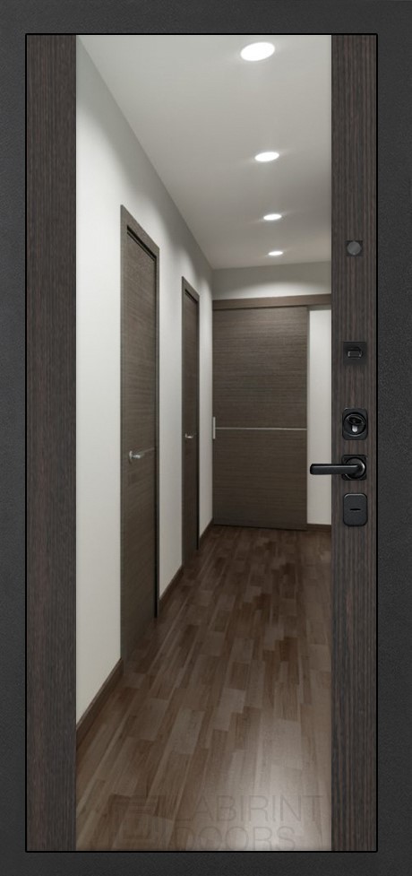 Внешняя отделка: Фрезерованная МДФ панель 10 мм, цвет "Орех американский" с патиной и вставками из металла в цвет наличника (заподлицо)