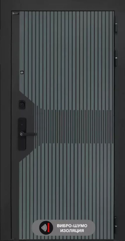 Внешняя отделка: Фрезерованная МДФ панель 10 мм, цвет "Velutto Verde" с патиной и вставкой из металла в цвет наличника (заподлицо)